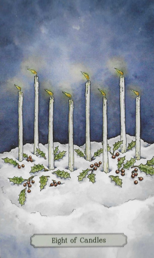 Today it’s good to explore these ideas a bit more, in the context of “Why does this matter?” So we turn over the next card and here we find the 8 of Candles or 8 of Wands as it’s usually known.