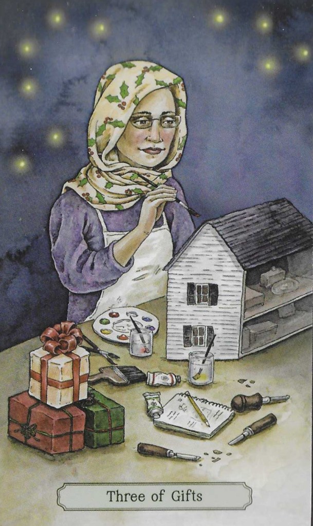 In answer to that question, we have the 3 of Gifts. This card illustration is from the Yuletide Tarot. In other decks — such as the Rider-Waite-Smith Tarot — it would be called the 3 of Pentacles.