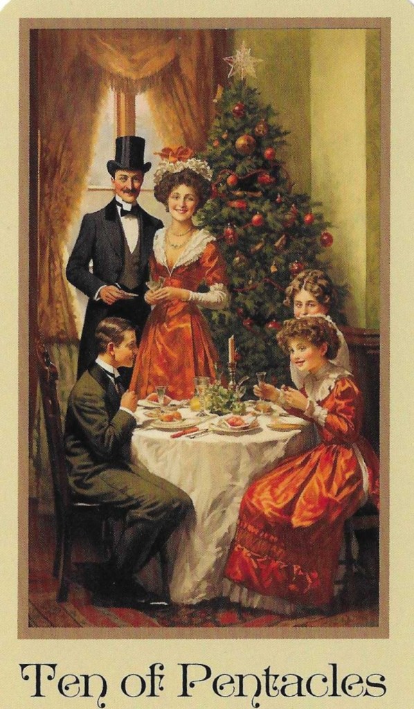 Oh, what a perfect card we’ve drawn! It’s the 10 of Pentacles. What card could possibly be more perfect as an expression of the holiday season?